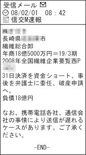 M速報 信交M速報(Mはモバイルの略) とは、 携帯電話に、メールで企業倒産、動向などの第一報を即時に配信いたします。信用情報を既にお取りいただいている会員様がお申し込みの対象となります。 モバイル時代の便利なサービスです。 料 金 1年間 9,000円(税抜き) 信用情報ご契約の場合、特別価格6,000円(税抜き)でご提供させていただきます。 実際に送信されたM速報記事のサンプル